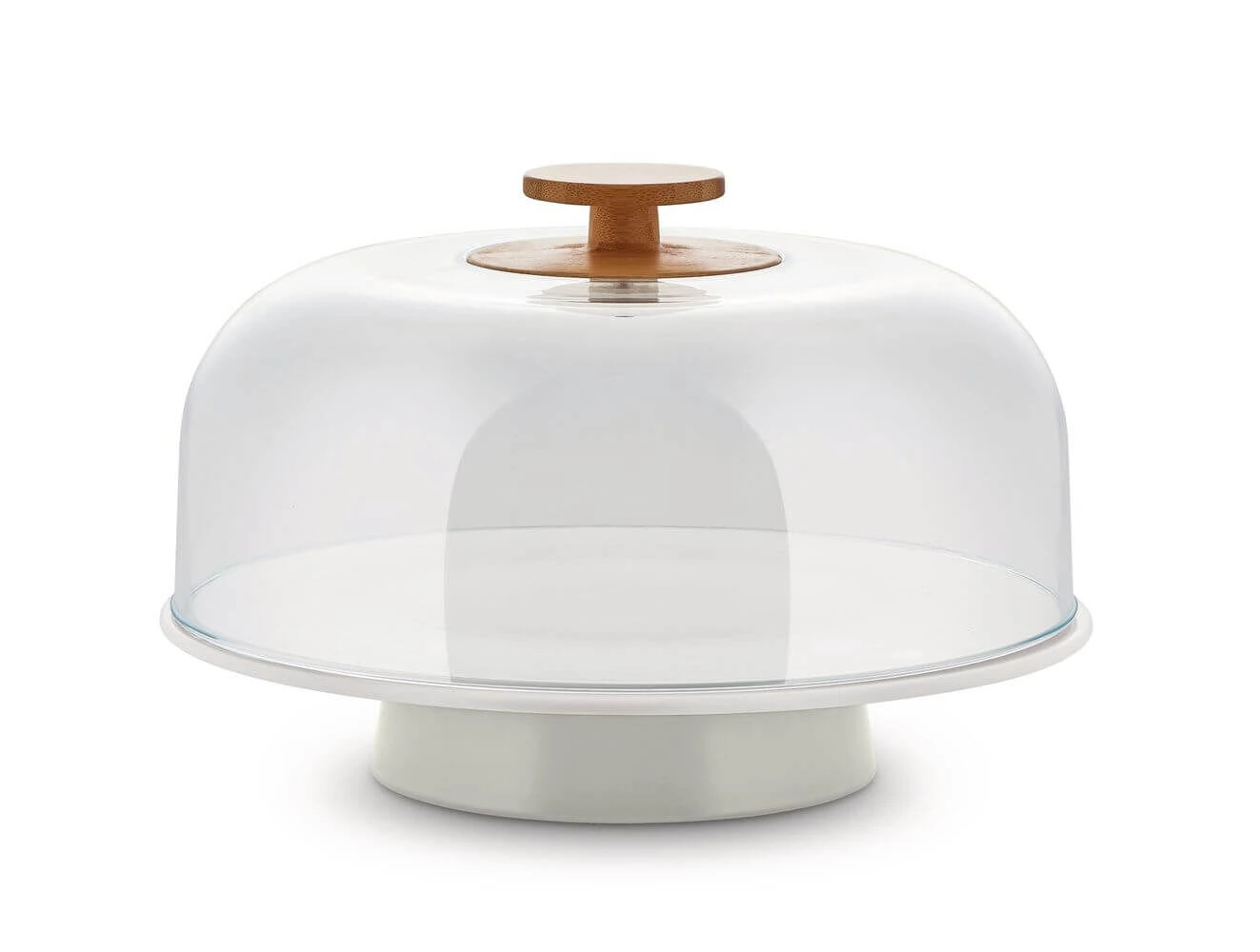 De elegante taartplateau van Alessi is gemaakt van wit, porseleinen bord met een warmgrijze, porseleinen voet. De stolp is van glas met een houten knop. De taartplateau is ontworpen door Elric Petit, Augustin Scott de Martinville en Grégoire Jeanmonod binnen de Mattina-collectie. De taartplateau heeft een diameter van 31,6 cm en een hoogte van 21,5 cm. Gebruik als plateau met stolp voor het bewaren van uw zelfgebakken taart.