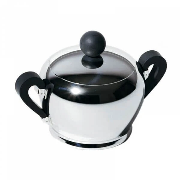 De Alessi Bombé suikerpot is vervaardigd uit gepolijst roestvrij staal met een bakelieten handgreep. De pot is 10 centimeter hoog, 10,5 centimeter in diameter en 16 centimeter van tuit tot handgreep. Dit servies is ontworpen door Carlo Alessi, de zoon van de oprichter van het bedrijf.