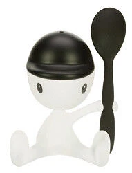 De Alessi Cico eierdop is ontworpen door Stefano Giovanonni en is 9 x 8 x 11,5 cm. Het zwarte kunststof figuur heeft in zijn hand een zwarte eierlepel. De pet dient als zoutvaatje.