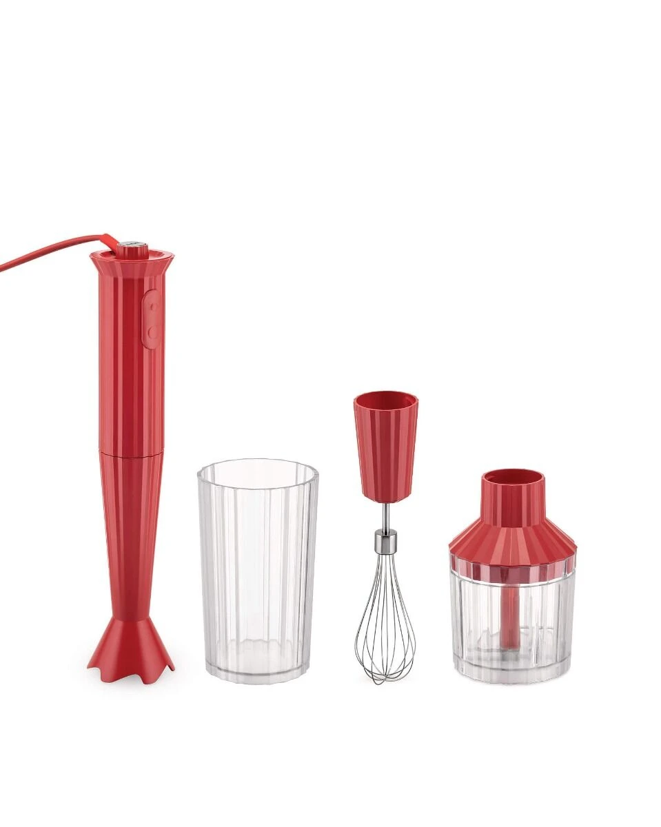 De Alessi Plissé staafmixer is gemaakt van rood kunststof en komt met een doorzichtige kunststof mengbeker met een inhoud van 800 ml, een hakmolen met een inhoud van 400 ml en ballongarde. De staafmixer heeft een diameter van 7 cm, is 34 cm lang en heeft een vermogen van 500 Watt. De Plissé staafmixer is ontworpen door Michele de Lucchi. Gebruik voor het mixen en hakken van diverse ingrediënten.