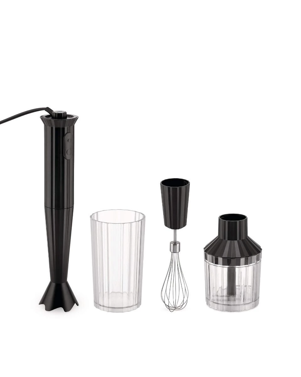 De Alessi Plissé staafmixer is gemaakt van zwart kunststof en komt met een doorzichtige kunststof mengbeker met een inhoud van 800 ml, een hakmolen met een inhoud van 400 ml en ballongarde. De staafmixer heeft een diameter van 7 cm, is 34 cm lang en heeft een vermogen van 500 Watt. De Plissé staafmixer is ontworpen door Michele de Lucchi. Gebruik voor het mixen en hakken van diverse ingrediënten.