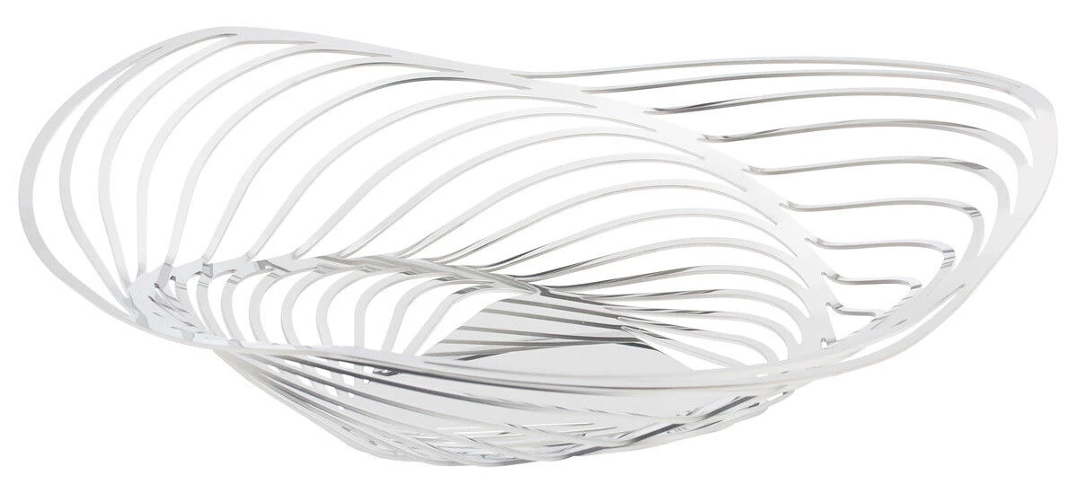 De Trinity schaal van Alessi is ontworpen door Adam Cornish, gemaakt van roestvrij staal en heeft een diameter van 26 cm. De schaal heeft sierlijke lijnen die elkaar kruisen. Voor het serveren van fruit en brood.